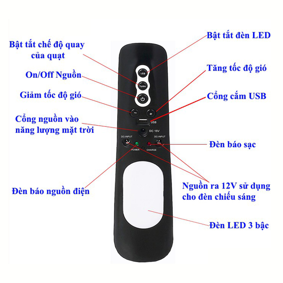 – Quạt sạc pin năng lượng mặt trời, Hoặc có thể sử dụng thêm điện lưới để tích điện